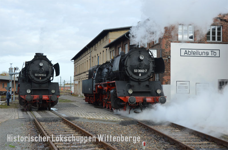 ![]() Am 29. Oktober 2016 standen die beiden Dampfloks 50 3570-4 und 50 3682-7 im Rahmen einer Fotoveranstaltung unter Dampf. |