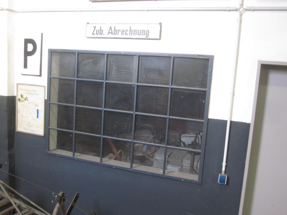 In die Wand ist auch ein Fenster eingelassen, hinter dem sich früher eine chemische Textilreinigung befand. Im Großraum Wittenberge gab es nämlich keine Wäscherei, welche die großen Mengen an verschmutzter Arbeitskleidung hätte reinigen können. Also errichtete die Deutsche Reichsbahn hier eine eigene Reinigung mit großen Waschmaschinen und Trocknungsanlagen. Damit jeder Bedienstete „seine“ Kleidung wiederbekam, waren alle Kleidungsgegenstände mit kleinen Metallmarken versehen, in die eine persönliche Nummer eingestanzt war. Gegen Nennung dieser Nummer wurden die Kleidungsgegenstände ausgehändigt.