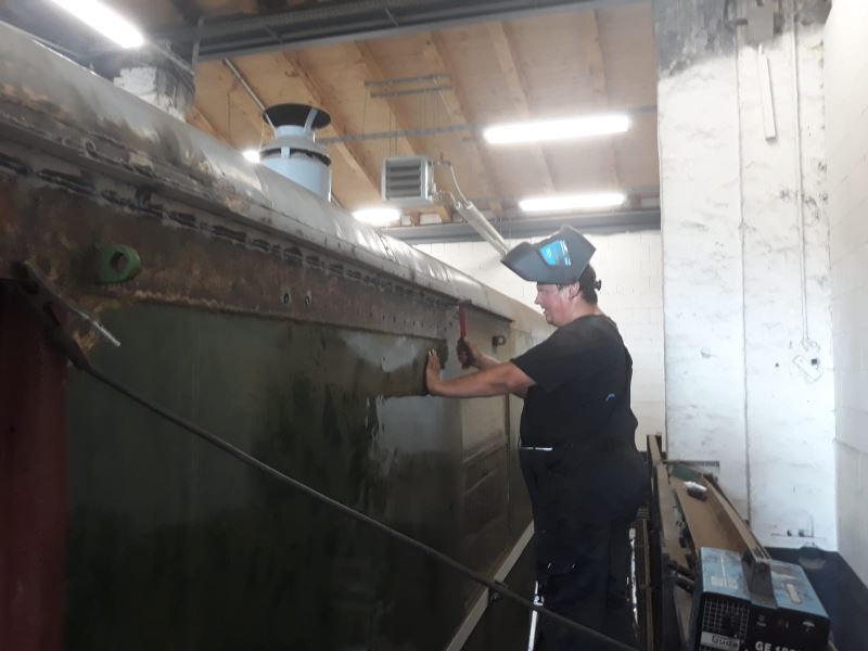 Zweitens wurde an unserem Autotransportwagen aus dem Regierungszug von Walter Ulbricht gearbeitet. Die lange Abstellzeit unter freiem Himmel hat die Übergänge zwischen den Wänden und dem Dach rosten lassen. Damit kein Regenwasser mehr eindringen kann, wurden großflächig neue Bleche eingeschweißt. Es ist geplant, den Wagen für Wechselausstellungen zu nutzen. Demnächst soll eine Ausstellung über Gleisbau eingerichtet werden.