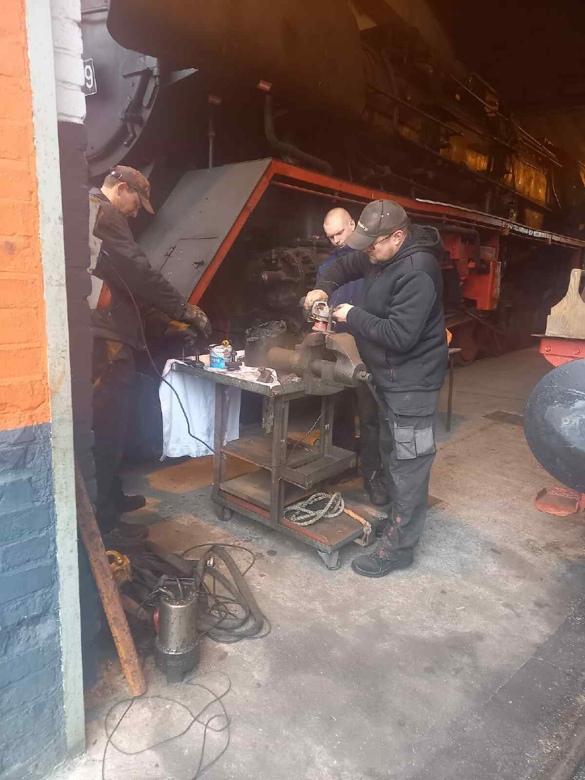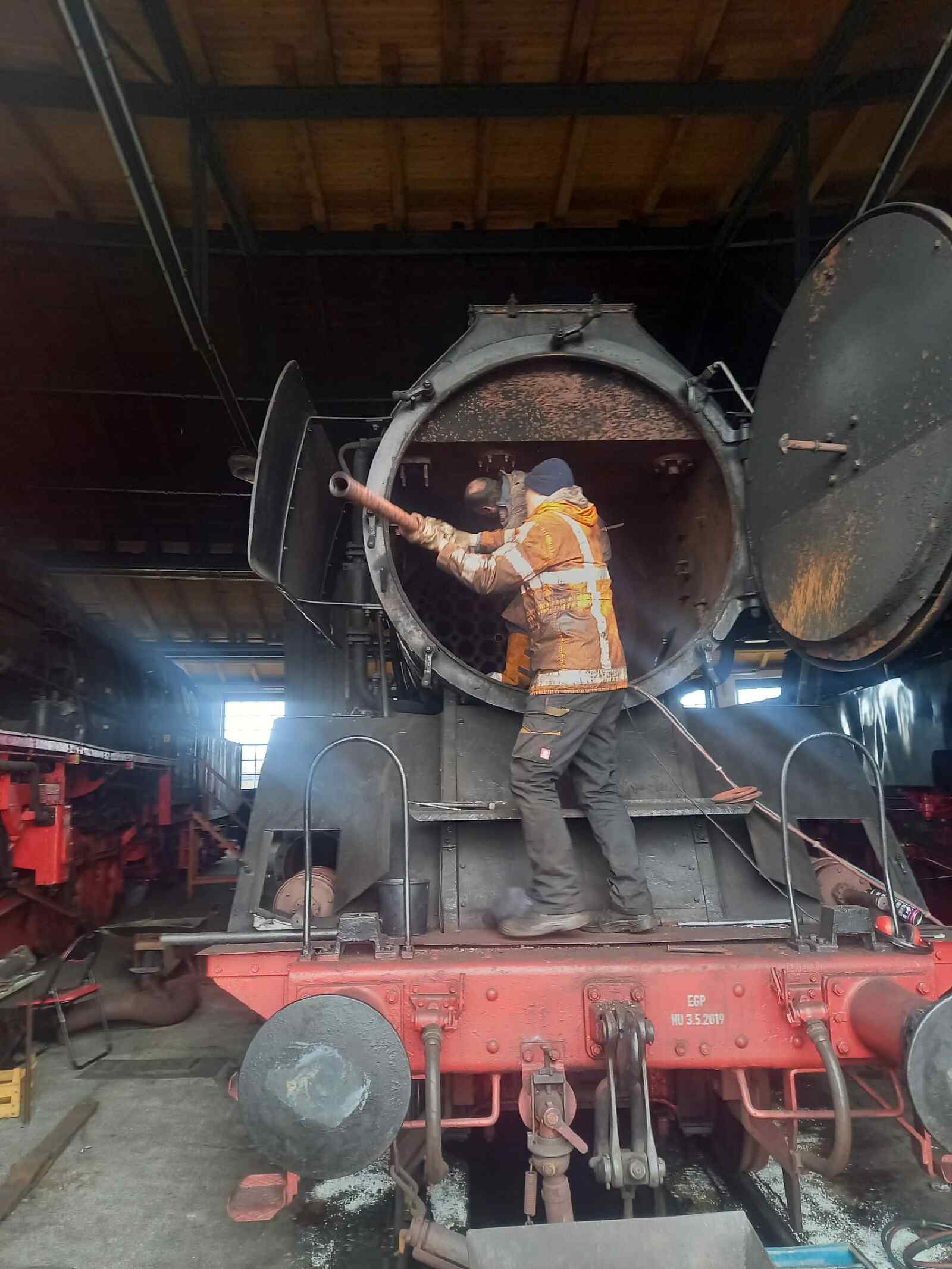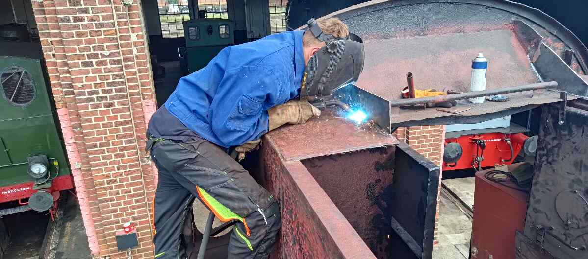 Weitere Fortschritte macht auch die Pflege der Dampflok 50 3570. Hier wurden die Klappen des sogenannten Aschkastens ausgebaut, gerichtet und mit neuen Blechen versehen. Der Aschkasten befindet sich unter dem Feuerrost der Lokomotive und nimmt Verbrennungsrückstände vom Feuer auf, das den Kessel beheizt.