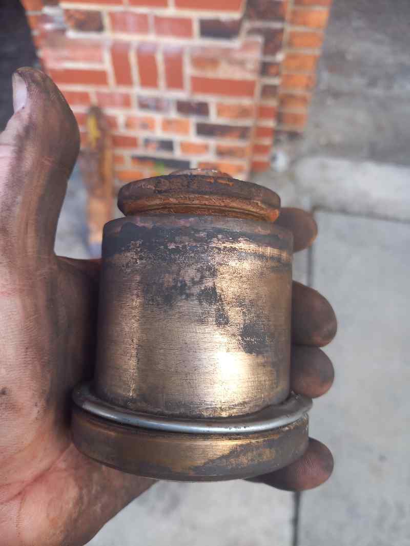 Das folgende Bild zeigt ein solches Rückschlagventil. Außen erkennt man den runden Sitz. Oben schaut der bewegliche Einsatz heraus, der von den Kalkablagerungen rot und braun eingefärbt ist.