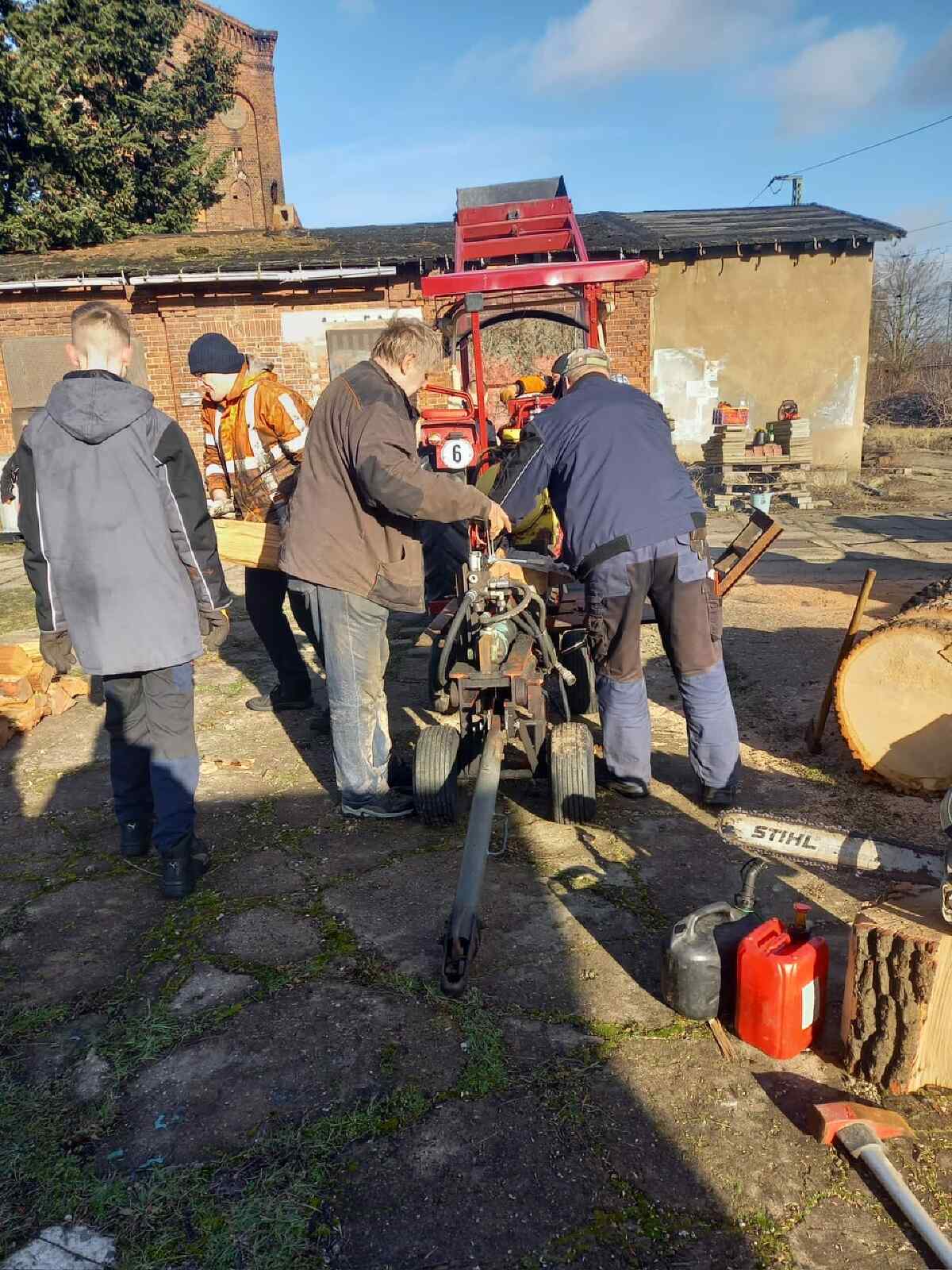 Ganz untypisch für ein Eisenbahnmuseum erscheint es, dass wir jede Menge Holz zu spalten hatten. Das wird benötigt, um unsere Dampfloks in der Saison anzuheizen. Im Winter nutzen wir es auch, um den Kaminofen im Stellwerk zu befeuern. Glücklicherweise haben wir nun einen Trecker, mit dem wir einen Holzspalter betreiben können. Und so wurde der Sonnenschein des vergangen Wochenendes genutzt, um die noch vorhandenen Baumstämme mit Kettensägen in Scheiben zu sägen und anschließend zu spalten.