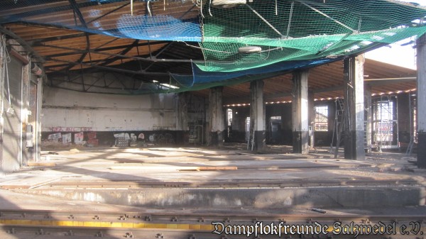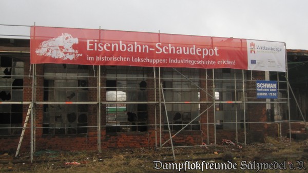 Witterungsbedingt mussten die Bauarbeiten am und im Bw Wittenberge von Anfang Januar bis Mitte Februar ruhen. Eis und Schnee machten insbesondere weitere Dacharbeiten unmöglich. Inzwischen sind die Handwerker aber wieder aktiv und so sind seit einer Woche wieder Fortschritte zu erkennen: