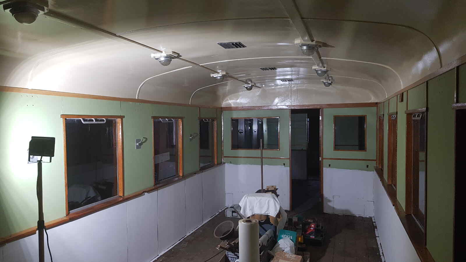 Langsam geht auch der Innenausbau unseres Wagens 197 805 weiter. Hier konnten die Deckenbeleuchtung, die Wandverkleidung und die Zierleisten darauf sowie die Fenstereinfassungen montiert und gestrichen werden. Die obere Hälfte der Fahrgasträume sieht schon wieder aus wie neu aus der Fabrik.