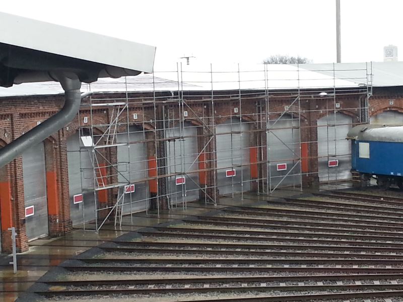 Nach den vergangenen zwei Stürmen arbeiten wir an der Beseitigung der Schäden. Zum einen hat der Sturm große Teile der Dachpappe abgedeckt, die unseren Lokschuppen vor eindringendem Regenwasser schützt. In den nächsten Tagen sind ca. 750 Quadratmeter Dachpappe neu aufzubringen. Hier wurde zum Schutz der Dachdecker ein Gerüst vor dem betroffenen Gebäudeteil aufgestellt.