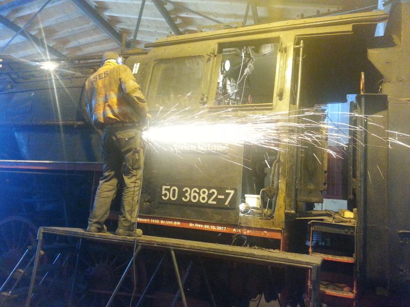 Auch bekamen wir Zuspruch und kurzfristige Unterstützung durch die Mitarbeiter des Werkes, so dass die Stangen jeweils innerhalb einer Stunde komplett angebaut waren. Nachdem wir den Zug aus dem Werk geholt hatten, stellten wir ihn für den nächsten Tag im Bw ab.