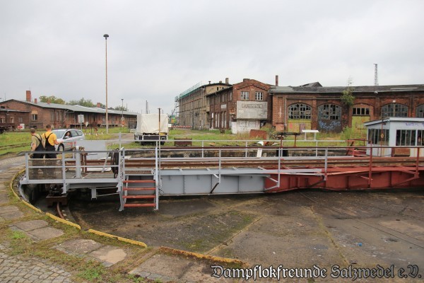 Die Arbeiten an der Drehscheibe sind ebenfalls weit vorangeschritten. So wurde die komplette Elektrik der Anlage überprüft und teilweise erneuert. Im Außenbereich wird das Kanalgleis am Wasserkran befahrbar gemacht. Dazu müssen die Schienen ausgebaut und die darunter befindlichen Holzschwellen erneuert werden. Größere Gleisbauarbeiten am und im Schuppen beginnen am 17.10.2011.