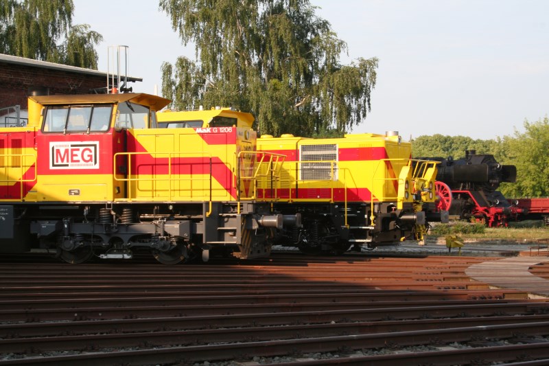 Bei unserer Veranstaltung am 4. und 5. Juli 2015 waren eine Hybridlok H3 von Alstom und eine dieselhydraulische Streckenlauflok vom Typ G1206 zu sehen. Beide sind derzeit bei der Mitteldeutschen Eisenbahngesellschaft (MEG) in Betrieb.