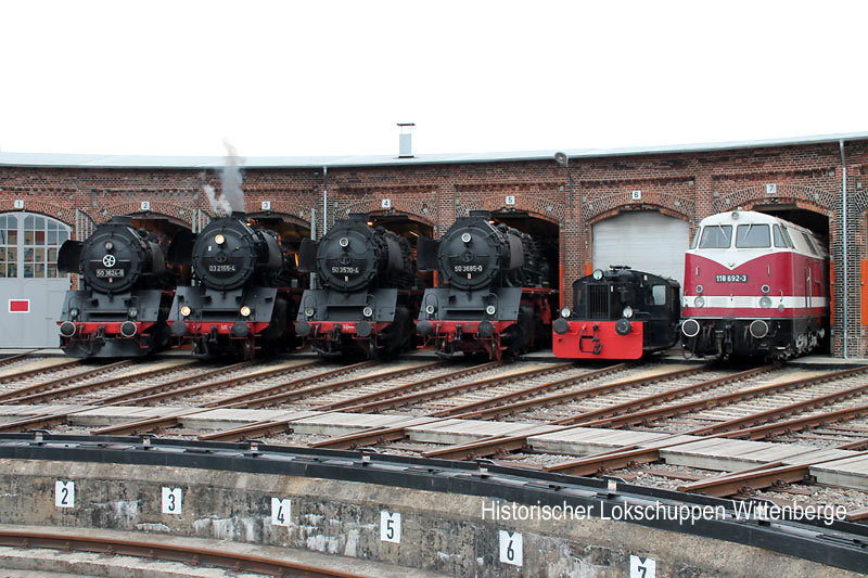 Am 18. August 2013 besuchte uns erneut die Schnellzugdampflok 03 2155-4, diesmal mit einem Sonderzug aus Lübeck. Hier gibt sie sich ein Stelldichein mit ihren Reko-Schwestern der BR 50.35. |