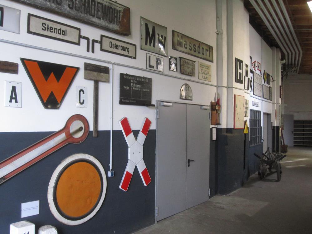 Von der Werkstatt auf dem Weg zur Fahrzeughalle gelangen unsere Besucher durch einen Gang, an deren Wänden wir verschieden Bahnutensilien angebracht haben. Hier sind verschiedene Signalmittel und Hinweisschilder zu erkennen, die früher für den Bahnbetrieb typisch waren.