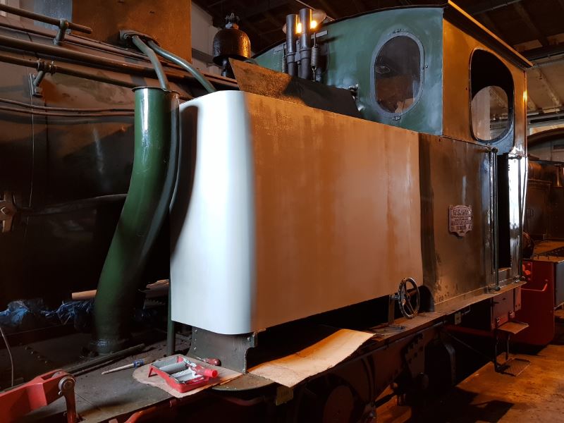 Die Vorbereitungen auf die nächste Saison sind in vollem Gang. Zunächst zu den Fahrzeugen: Emmas neuer Kohlenkasten wurde inzwischen grundiert. Wir warten nun noch darauf, dass die Lufttemperatur in einen Bereich steigt, der die grüne Endlackierung zulässt. Bis zur ersten Veranstaltung muss sie wieder hübsch aussehen.