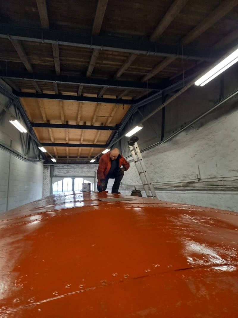 Auch am Tender für die Dampflok 50 3570 ging der unerbittliche Kampf gegen den Rost und Kalkablagerungen weiter. Heute wurde die Innenseite des Tenders von grobem Kalk befreit und die Verschlüsse der Ablaufventile gangbar gemacht. Mit ihnen kann der Wasserzulauf vom Wasserkasten des Tenders zur Lok unterbrochen werden, wenn es eine Störung an den Pumpen der Lok oder Wartungsarbeiten gibt. Die Arbeiten sind ziemlich mühsam, weil sich die Kollegen vom hintersten Ende des Tenders bis zur anderen Seite, die zur Lok zeigt, vorarbeiten müssen. Dabei mussten sie sich durch einige Aussparungen in den sogenannten Schwallblechen zwängen. Die Schwallbleche verhindern, dass das Wasser während der Fahrt ungebremst durch Tender schwappt. Die Arbeiten sind sehr unangenehm, da der Platz sehr begrenzt ist, es dunkel ist und die Geräusche stark hallen. Keine Arbeit für Menschen mit Platzangst.