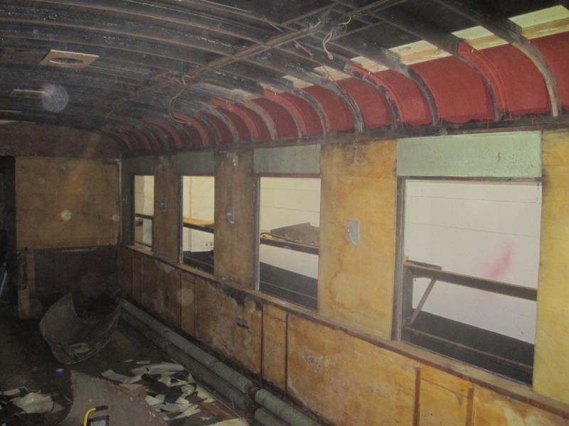 Der Innenraum ist derzeit nahezu vollständig entkernt. Bei den hölzernen Wandverkleidungen konnten wir feststellen, dass diese mehrheitlich wiederverwendbar sind. Ihre Oberflächen werden in naher Zukunft behandelt und neu lackiert. Die innere Dachverkleidung wurde abgenommen, um die Dachspanten, die Elektrik für die Deckenbeleuchtung und die Mechanismen für die Deckenlüfter zu kontrollieren.