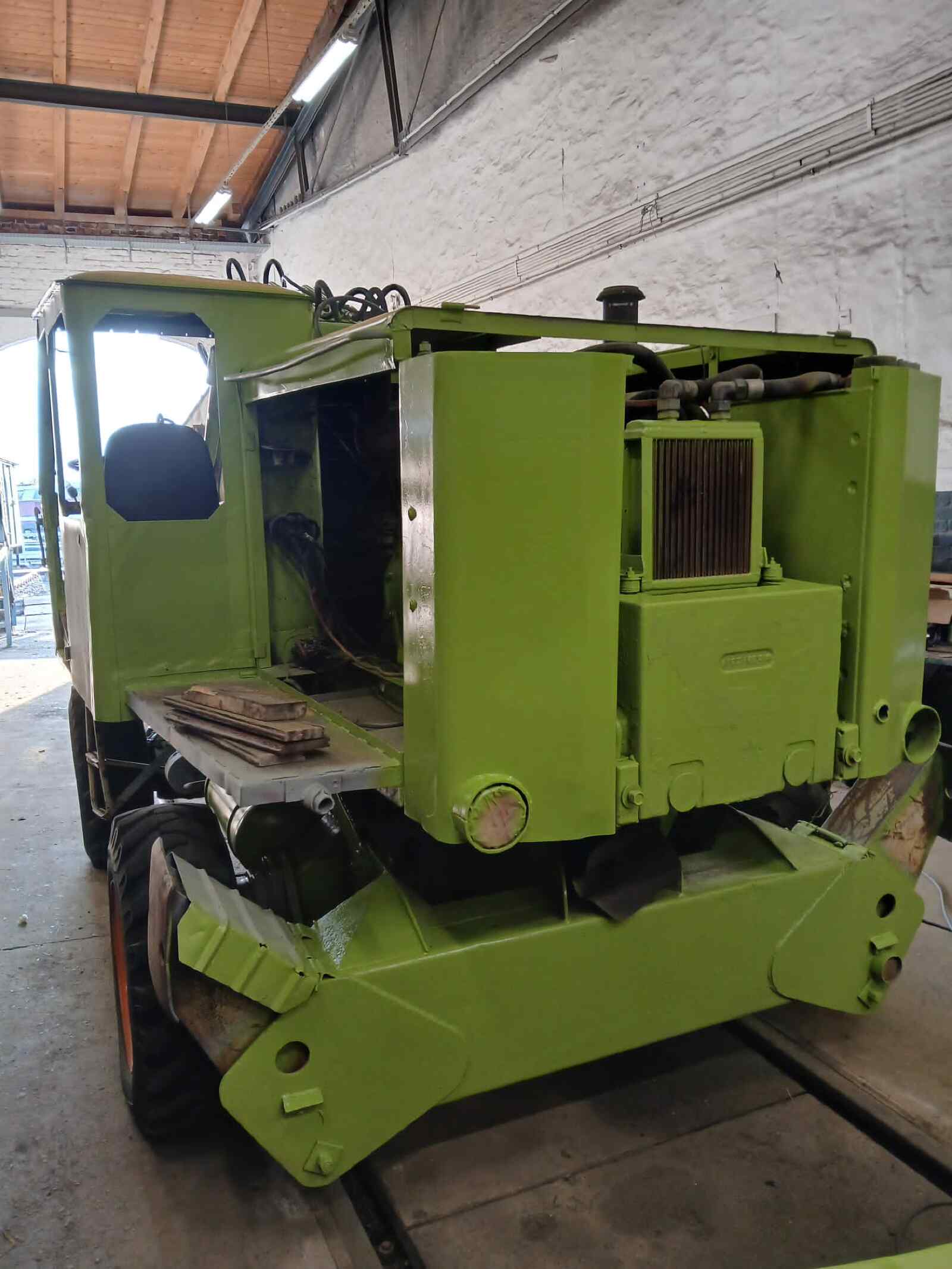 Fortschritte macht zu Glück auch unser Bagger T174. Nachdem nun alle Arbeiten an seinem Innenleben und seinem Blechkleid abgeschlossen wurden, wird er derzeit lackiert in der typisch grünen Farbe, an die sich der ein oder andere vielleicht noch aus DDR-Zeiten erinnert. Nun müssen noch die neuen bzw. aufbereiteten Scheiben und die Lampen eingebaut werden. Zuletzt wird er noch beschriftet und steht uns dann hoffentlich wieder für eine lange Zeit für Arbeiten im Museum zur Verfügung.