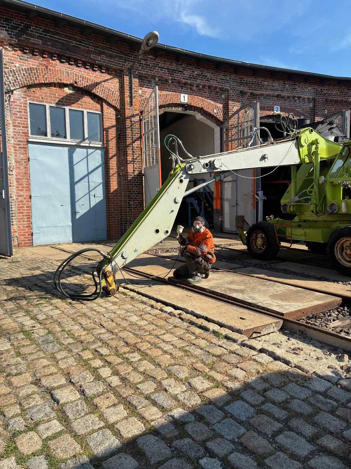 Damit ist einer unserer großen Träume wahrgeworden und wir danken allen Beteiligten sehr herzlich für ihre Großzügigkeit und Hingabe, ohne die das Projekt niemals möglich gewesen wäre. Wir wünschen der Lok allzeit gute Fahrt und Ihnen, liebe Freunde des Museums, mindestens ein Lächeln im Gesicht, wenn Sie die Lok demnächst in unserem Museum oder unterwegs sehen. Die Überführung war nun überhaupt nur möglich, weil die neue Gleiszufahrt zum Bahnbetriebswerk Wittenberge und damit auch zu unserem Museum soeben fertiggestellt wurde. Sie erinnern sich? Der Bahnhof Wittenberge wird derzeit dem erhöhten Verkehrsbedarf angepasst. Wir berichten darüber demnächst in einem gesonderten Newsletter. Ansonsten haben wir in Wittenberge die Zeit genutzt, um ein wenig im Lokschuppen und der Werkstatt umzuräumen. Wir hatten ja berichtet, dass wir zwei Ersatzmotoren für unsere beiden Dieselloks 118 748 und 114 774 erwerben konnten, die wir nun wettergeschützt im Lokschuppen untergebracht haben. Wenn Sie uns also in der nächsten Saison besuchen, können sie sie hier bestaunen. So ein Motor ist übrigens etliche Tonnen schwer und nicht so einfach zu bewegen, wenn man nicht über das notwendige Equipment verfügt. Zum Glück steht uns dafür nun ein großer Gabelstapler aus DDR-Produktion zur Verfügung, der früher im nahegelegenen Nähmaschinenwerk eingesetzt wurde. Für die Technikbegeisterten: Es handelt sich um einen Takraf DFG6302/HG aus dem Jahr 1977. Er wurde vom VEB Verlade- und Transportanlagen Leipzig "Paul Fröhlich" gebaut und wird von einem Dieselmotor angetrieben, wie man ihn auch aus DDR-LKWs der Bauart W50 kennt.